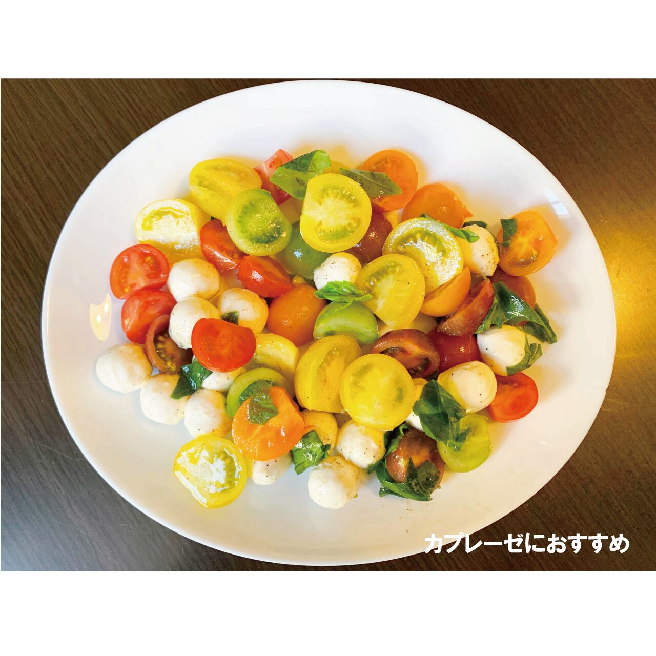 カラフルトマトとモッツァレラチーズで食卓を彩るカプレーゼの完成。味付けはバジル、塩こしょう、オリーブオイルでOK!